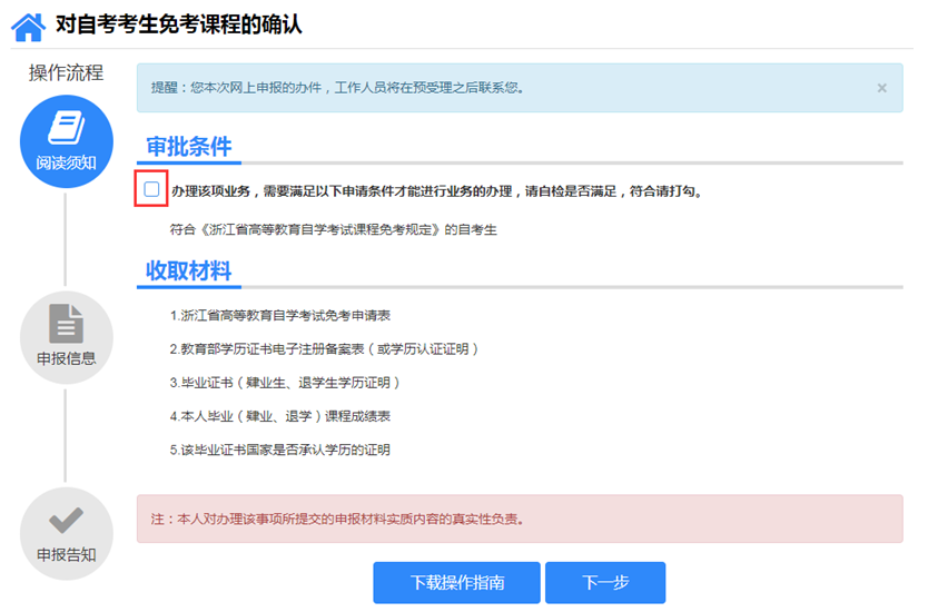①阅读须知。确认满足审批条件后,打勾并点击下一步。