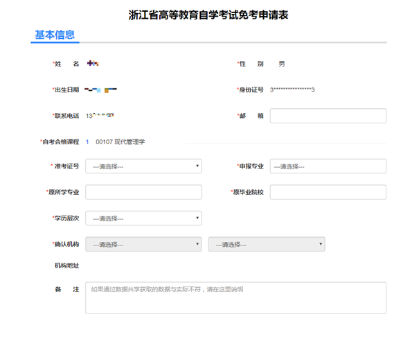(一)考生办理免考申请前,须登录自学考试信息网(zk.zjzs.net)查询核对个人信息(姓名、身份证号、准考证号等)。如发现个人信息有误,须携带相应证明材料(身份证、户口本等)在11月11日前(工作时间)到当地教育考试机构办理登记修改手续。