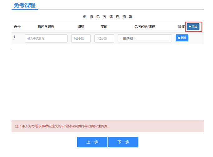 ③填写需要免考的课程信息,点击下一步。