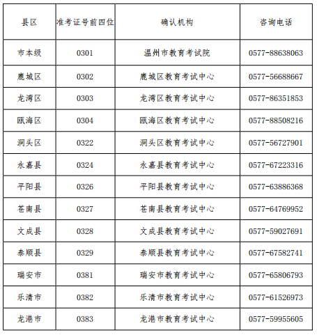 温州市区 | 0301 | × | × | 仅受理只有0301准考证的考生 |
