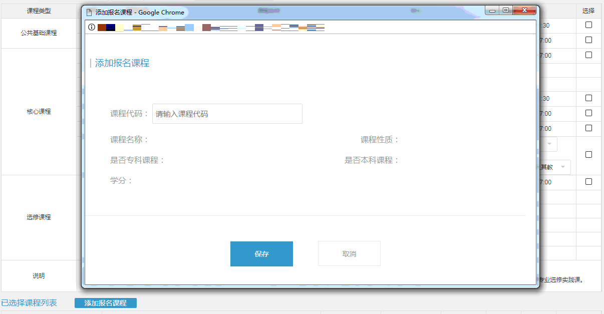 (3)选择专业,勾选课程,如需报考页面所列课程以外的课程,点击“添加报名课程”,在添加报名课程页面填写所需报考课程的代码并保存。理论课程同一考试时间(同一个半天)只能选择1门课程。