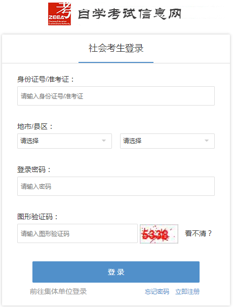 考生在“社会考生登录”界面使用身份证号或准考证号登录,登录密码为身份证号后六位。由于身份证号或密码错误无法登录,首次登录系统的考生,请与当地教育考试机构联系;原已登录过系统的考生,通过“忘记密码”功能自行重置密码。