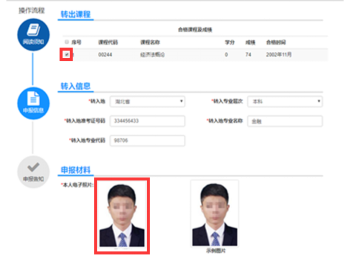 (2)填写信息。选择准考证号、专业层次等信息,填写接收办理结果的邮箱,勾选转出课程,上传本人一寸证件照,点击下一步。