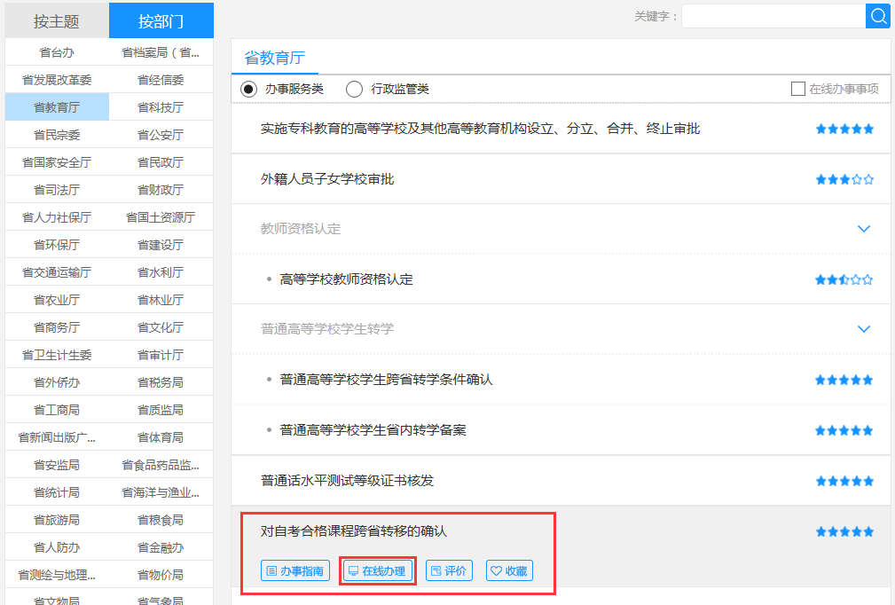 2.搜索“跨省转移”,点击“对自学考试合格课程跨省转移的确认”