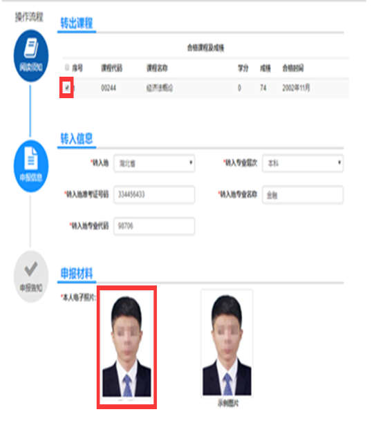 (2)填写信息。选择准考证号、专业层次等信息,填写接收办理结果的邮箱,勾选转出课程,上传本人一寸证件照,点击下一步。