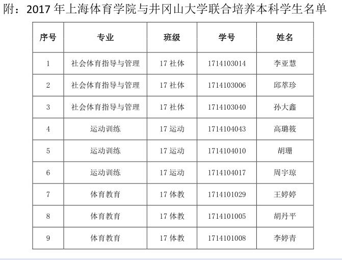 根据《上海体育学院与井冈山大学联合培养本科生工作方案》,经学院选拔及教务处审核,现拟选派李亚慧等9位同学赴上海体育学院进行联合培养(具体名单见附件),现予以公示。