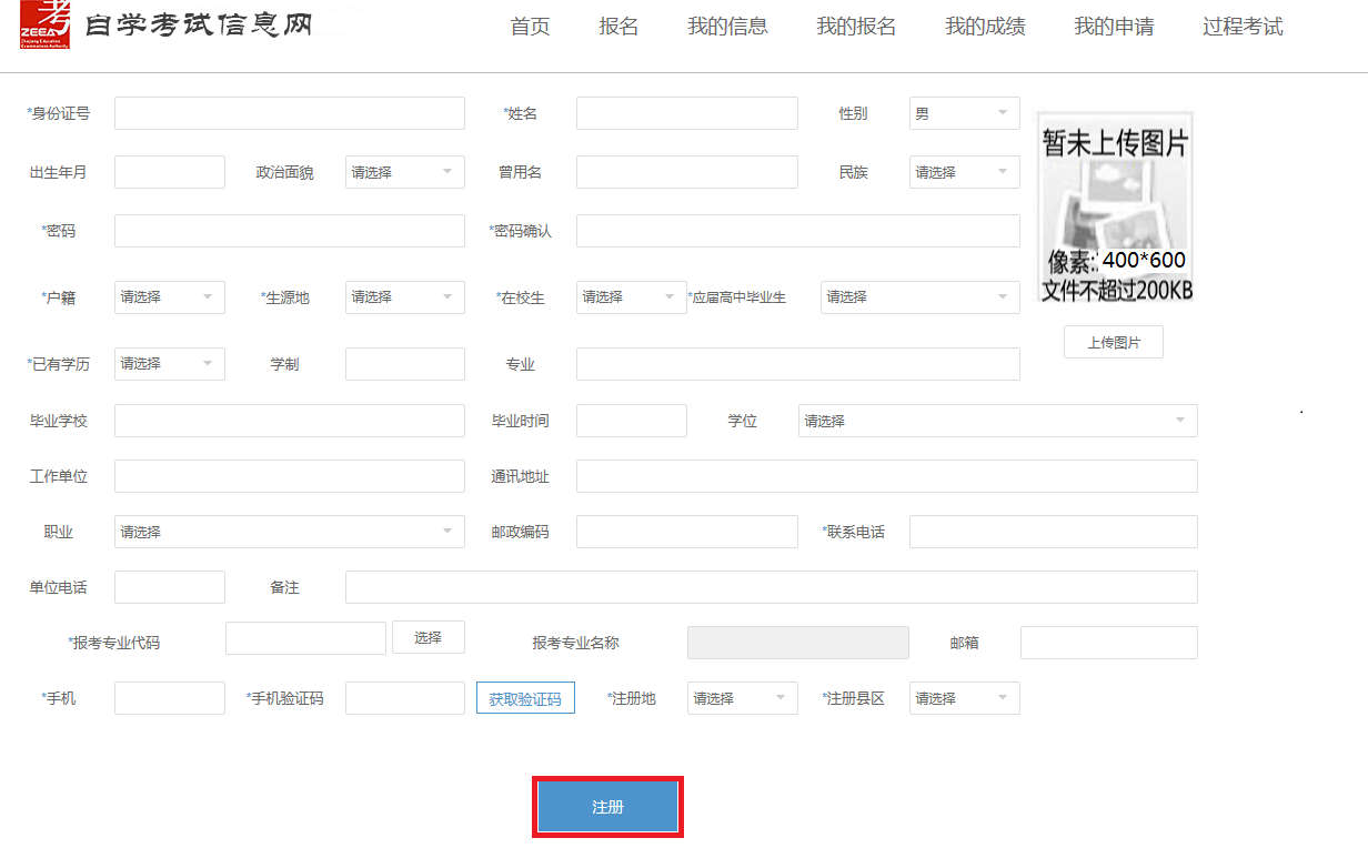 2.在注册页面填写基本信息并上传照片,标注“*”的为必填项。填写完成后,点击注册页面下方“注册”按钮完成注册。考生须牢记自己设定的密码。