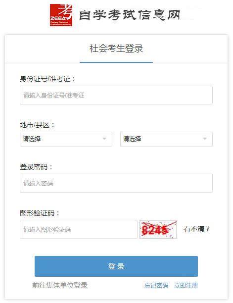 注册审核通过后,在“社会考生登录”界面使用身份证号登录,登录密码为注册时设定的密码。登录时需选择地市/县区,所选地市/县区即为参加考试的地区,系统会有信息提示。