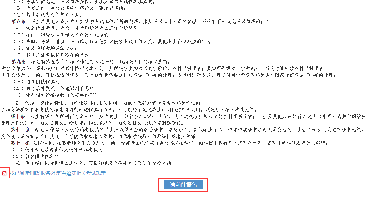 (2)阅读“考生报名必读”,在“我已阅读知晓‘报名必读’并遵守相关考试规定”前方框内打勾,点击“请前往报名”