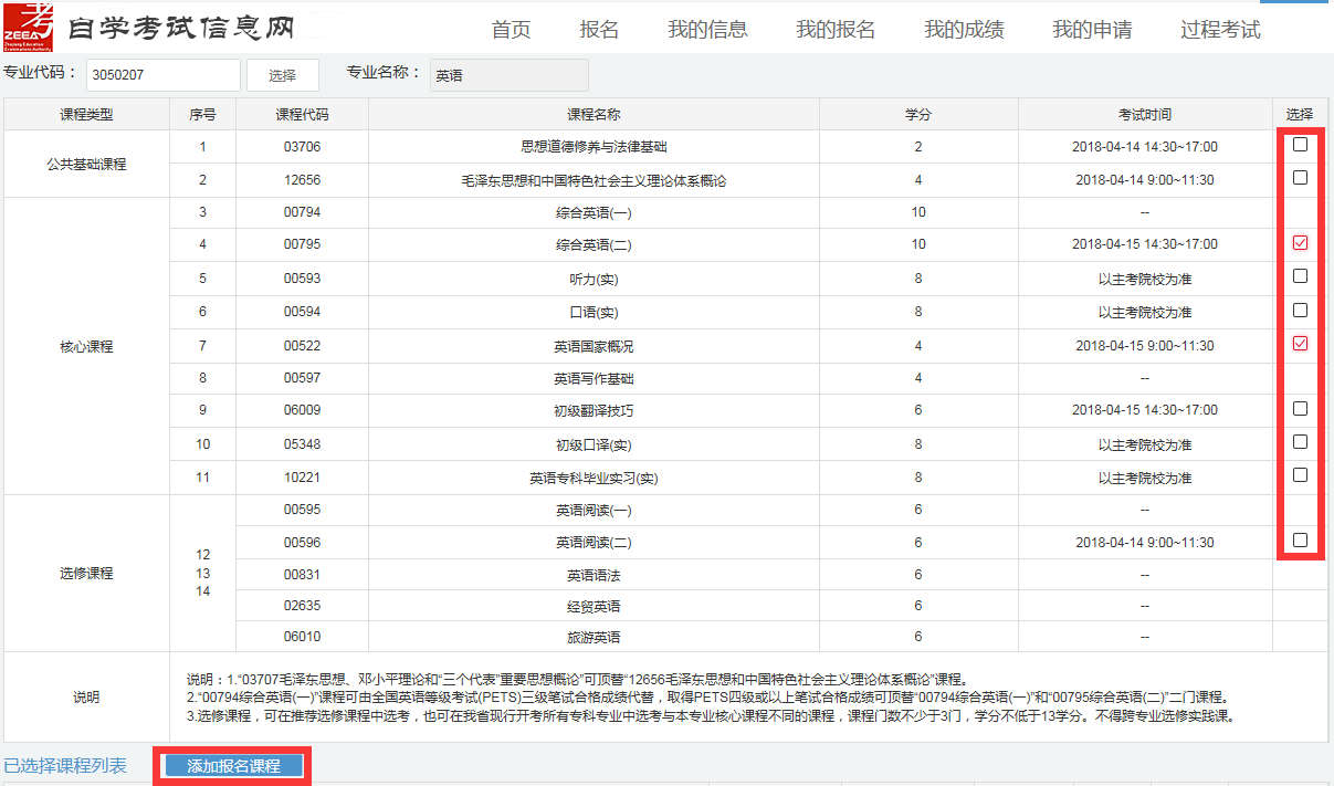 (3)选择专业,勾选课程,如需报考页面所列课程以外的课程,点击“添加报名课程”,在添加报名课程页面填写所需报考课程的代码并保存。理论课程同一考试时间只能选择1 门课程。
