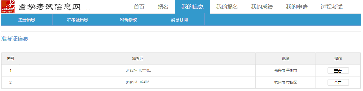 点击“我的信息-准考证信息”菜单,进入准考证信息页面进行查看。