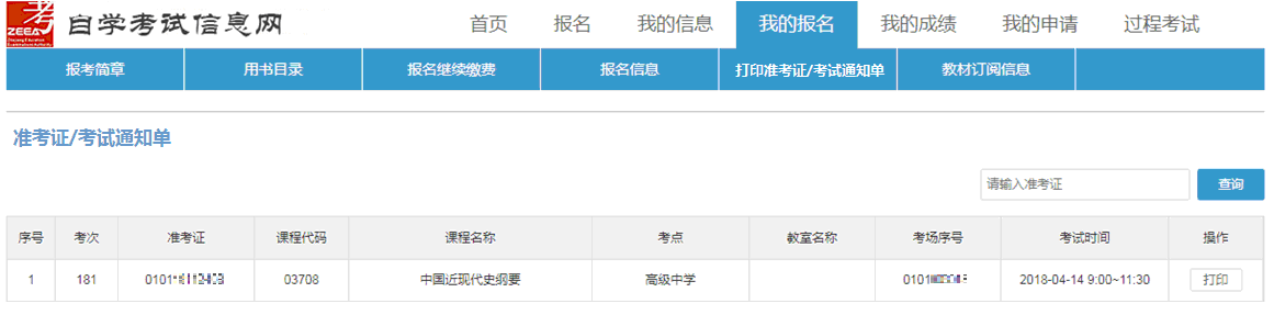 考前5 天,点击“我的信息-打印准考证/考试通知单”菜单进入准考证/考试通知单页面,点击“打印”按钮进行打印准考证/考试通知单操作。