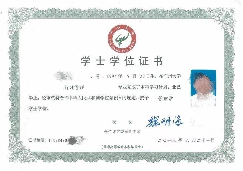 广州大学自考学位证书样本